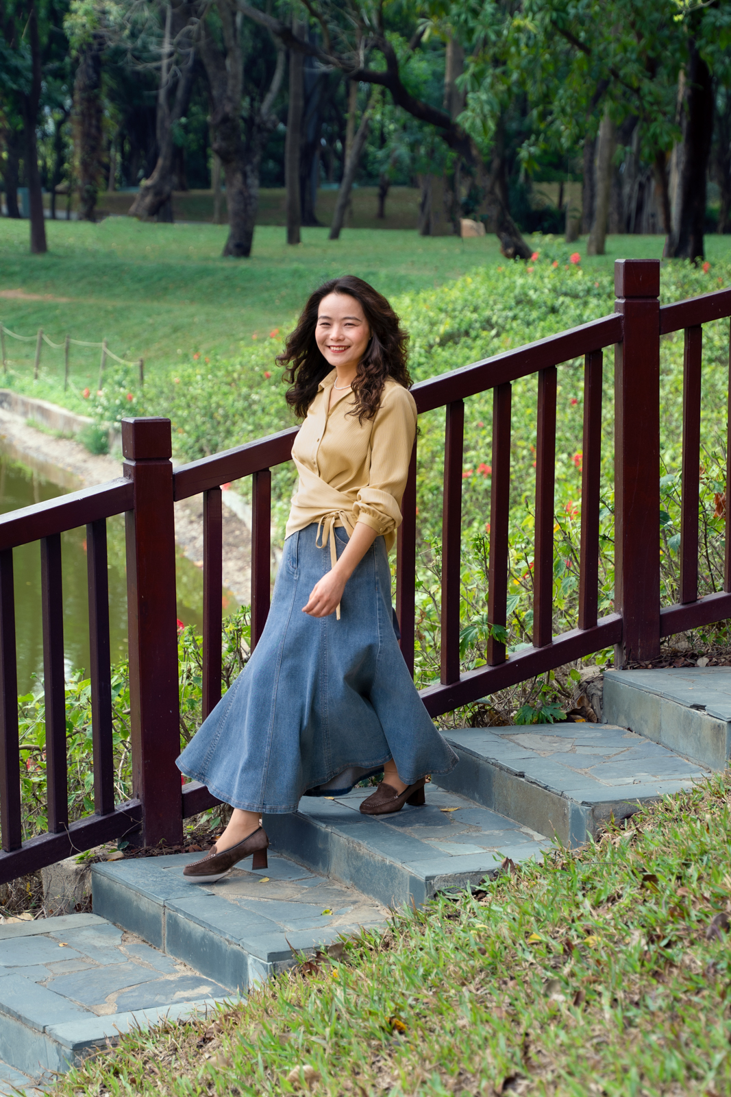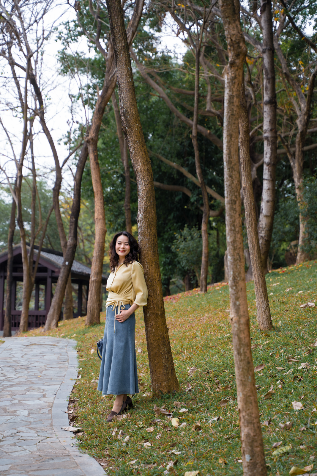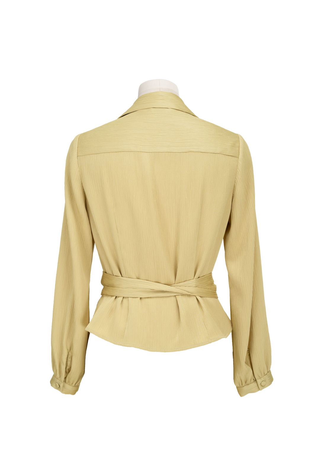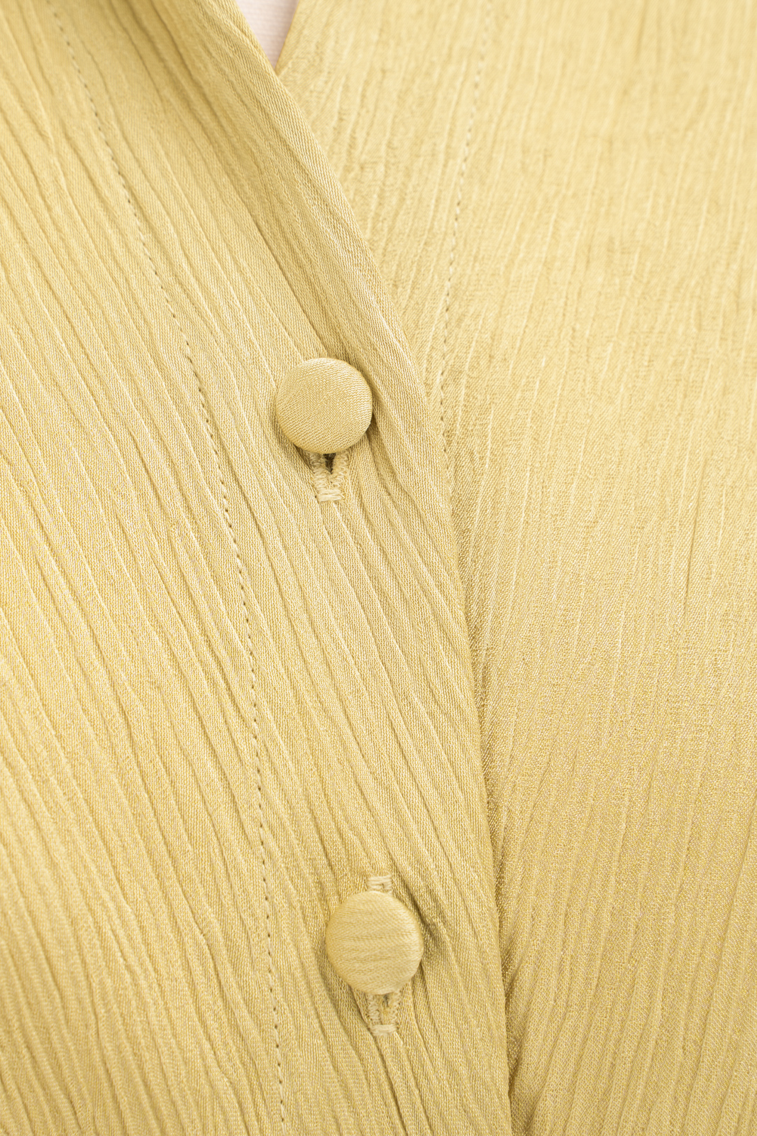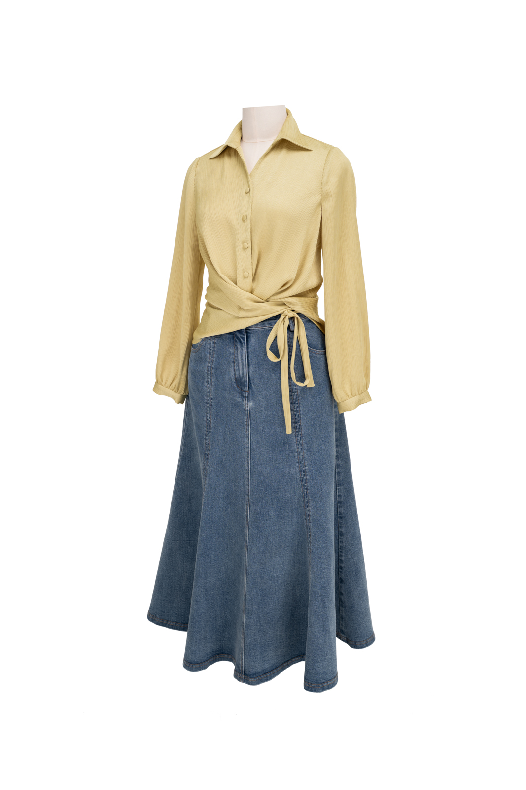 柔和的黄是春日里的明媚,是自然里生出的欢喜,令人喜悦的物产常常以黄色呈现,“幸福的黄”名副其实。带着褶皱纹理的进口纤维面料质感柔滑垂坠,泛着微微淡雅珠光,如月色朦胧的光芒。在经典衬衫的版型上,巧妙融入创意设计,下摆扭结与可调节的系带设计是神来之笔,让淑女穿出松弛优美的姿态,可根据自身喜好和穿着需求发挥创意,自由打造随意、有个性的造型,令形象具有设计感,让人常见常新……